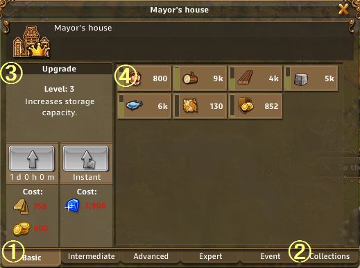 市長の家の中心的な役割は、資源倉庫である。 開拓者たちはここから仕事場に向かい、仕事場から資源をここへ運び込むという動きを繰り返す。 同様の機能はStorehouse(倉庫)にもある。 アップグレードすることで、保管できる資源の上限が上がっていく。