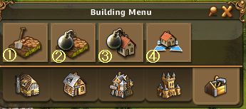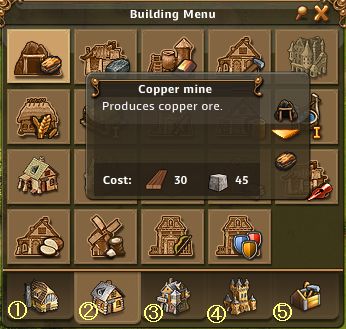 初期の開拓の基本は、まず建物をたてて今後の建築などに必要な資材を生産することである。 チャットの右側にある建物のアイコンをクリックすると、以下のような建築メニューが開く。 それぞれの建物にカーソルを合わせると、cost(コスト:建築に必要な資材)と、その建物での生産のインプットとアウトプットが表示される。 建物をクリックすると、建築可能なエリアが明るく表示されるので、任意の場所を選んで再度クリックすると建築予約される。そのさいに、Transport duration(移動時間)が表示されるが、これが短いほどセトラーが仕事場と倉庫を早く行き来できるので、建物の生産効率が高くなる。 建築予約された建物は、プレイ画面右側の建築タイムラインに順に表示される。