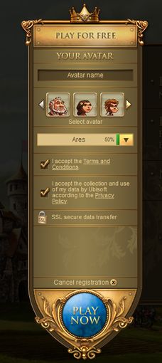 続いてプレイヤーの分身となるアバターを作成します。 "Avatar name"の欄にゲーム内で用いたい名前を半角英数字で入力します。ハイフン等も使えます。 下の画像からアバター画像を選択します。左右の△印を押せば、多くの種類のなかから選べます。 規約とプライバシーポリシーに合意したらボックスにチェックマークをつけ、青い"Play Now"ボタンを押します。 これでついにゲームスタートです!